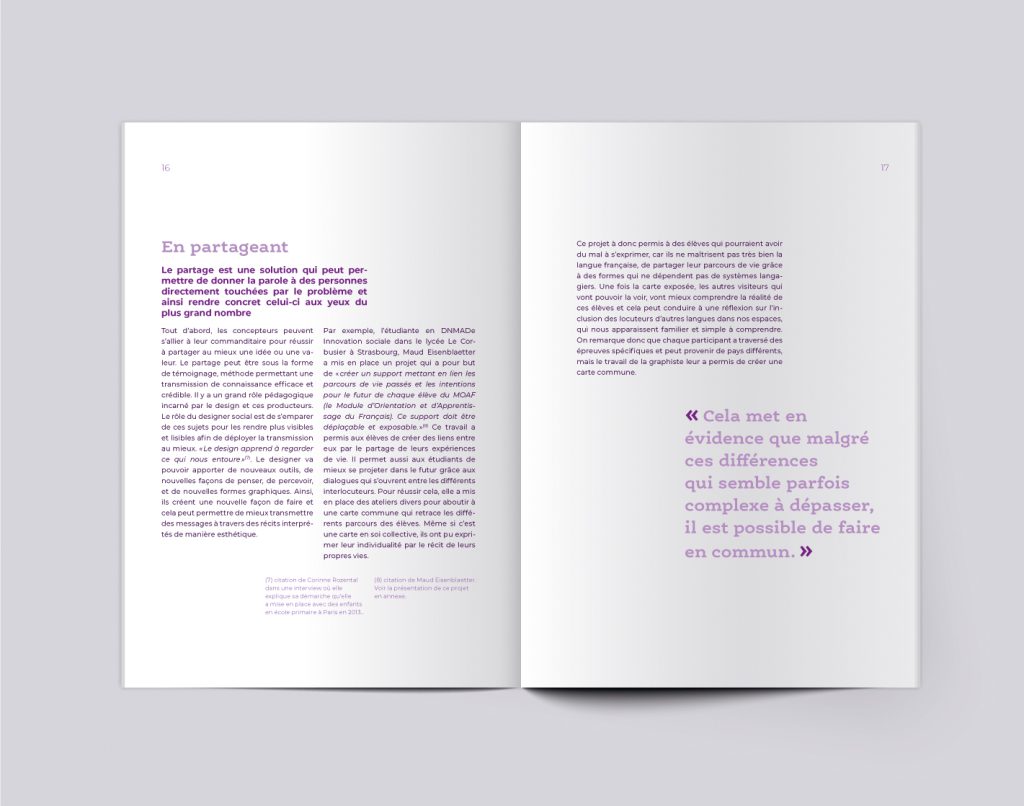 Ce premier mémoire, qui clôture ma licence en graphisme, manifeste mon envie de créer éthiquement et utilement. La problématique que j’ai soulevée est : le graphisme peut-il être un acte social ? J’ai alors cherché à définir ce design social puis à travers des études de cas j’essaie de mettre en évidence qu’effectivement le graphisme peut réellement aider à trouver des solutions aux crises sociales et climatiques actuelles.