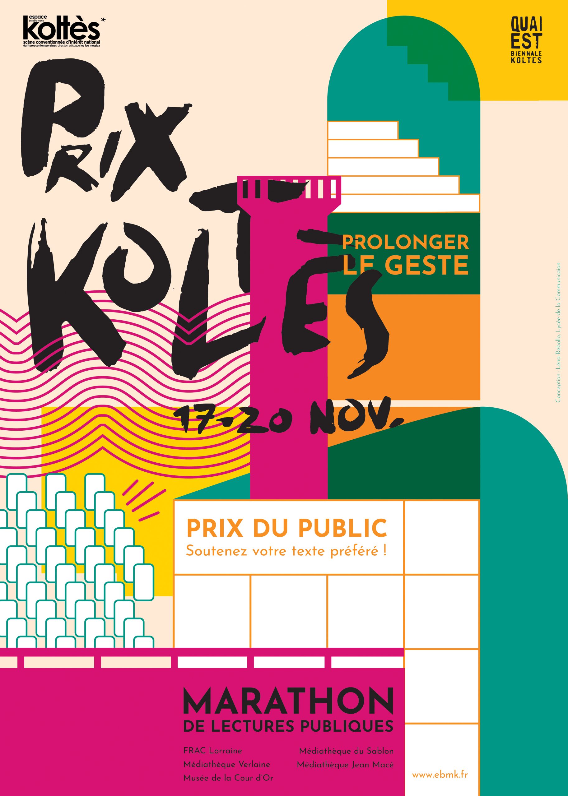Dans le cadre de l’événement du prix Koltès à Metz, nous avons eu l’opportunité de proposer chacune une affiche. L’objectif était de travailler autour de l’invitation et du partage. Dans un temps très restreint, j’ai alors proposé un travail autour de la géométrie architecturale marquée par les différents lieux de lecture. Les couleurs vives et les lignes viennent apporter le dynamisme souhaité par le client.