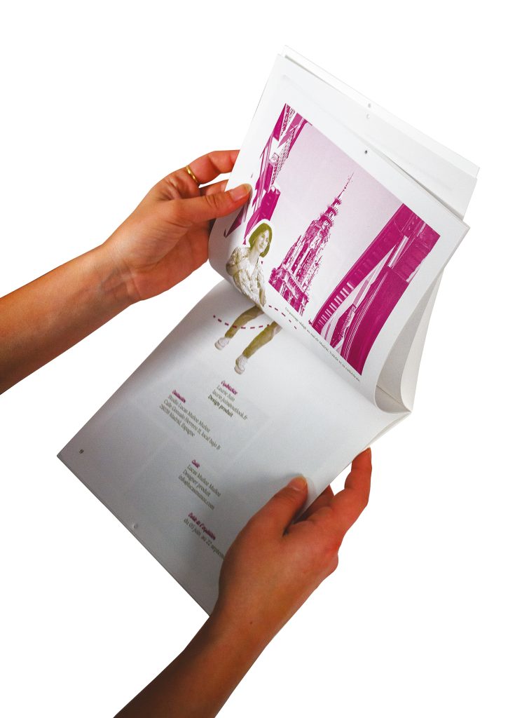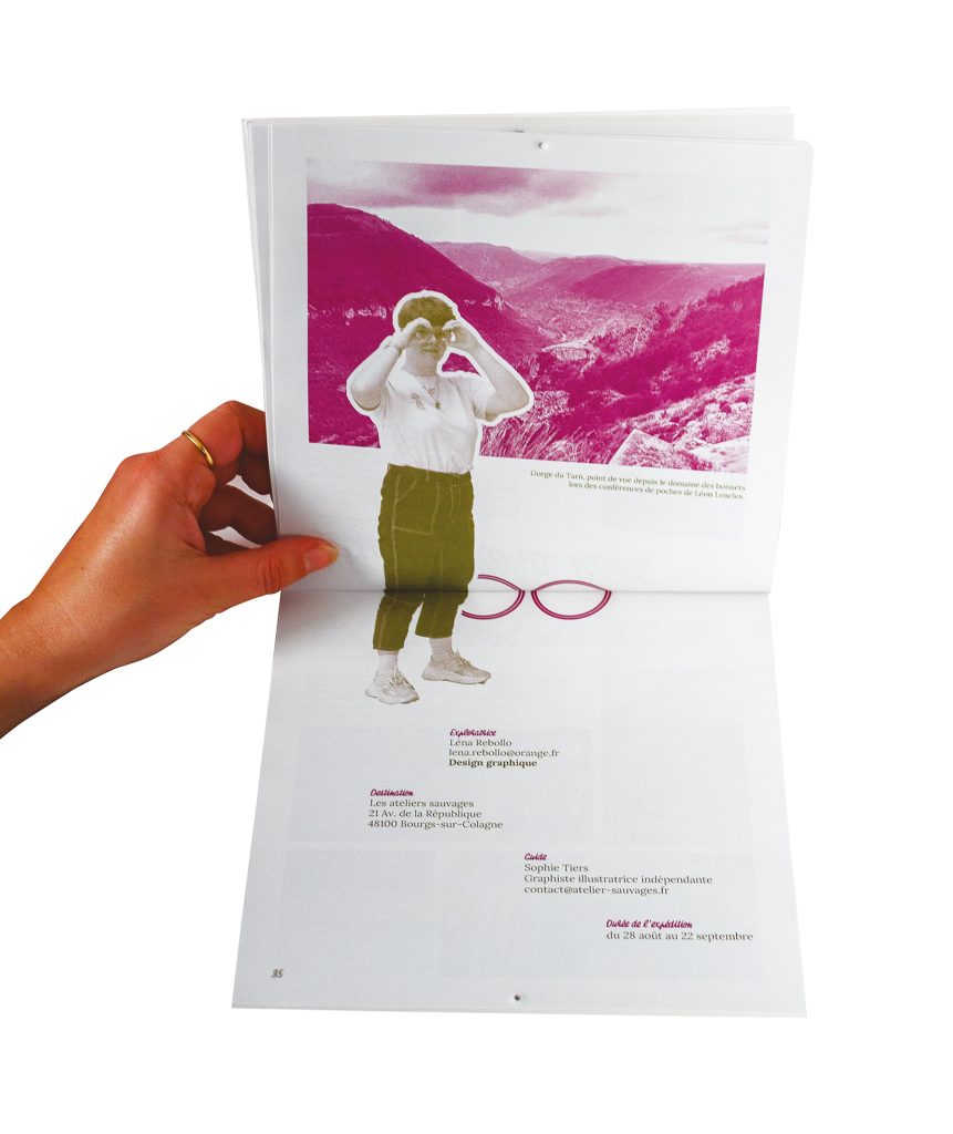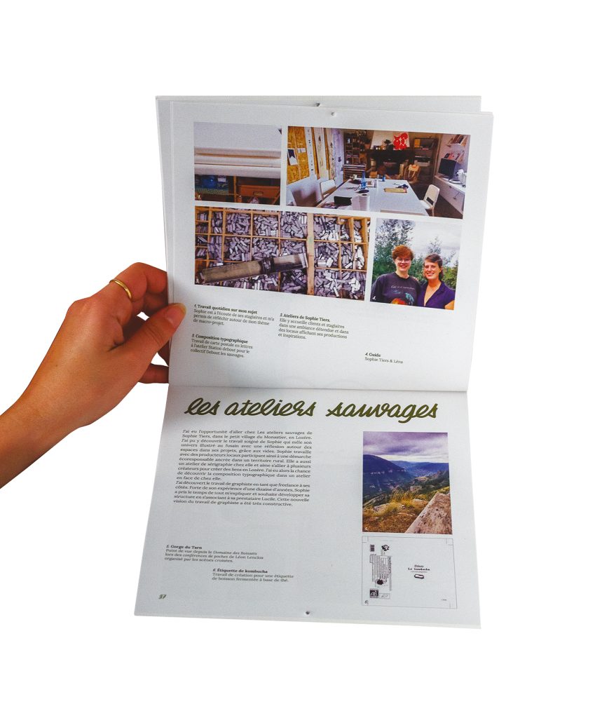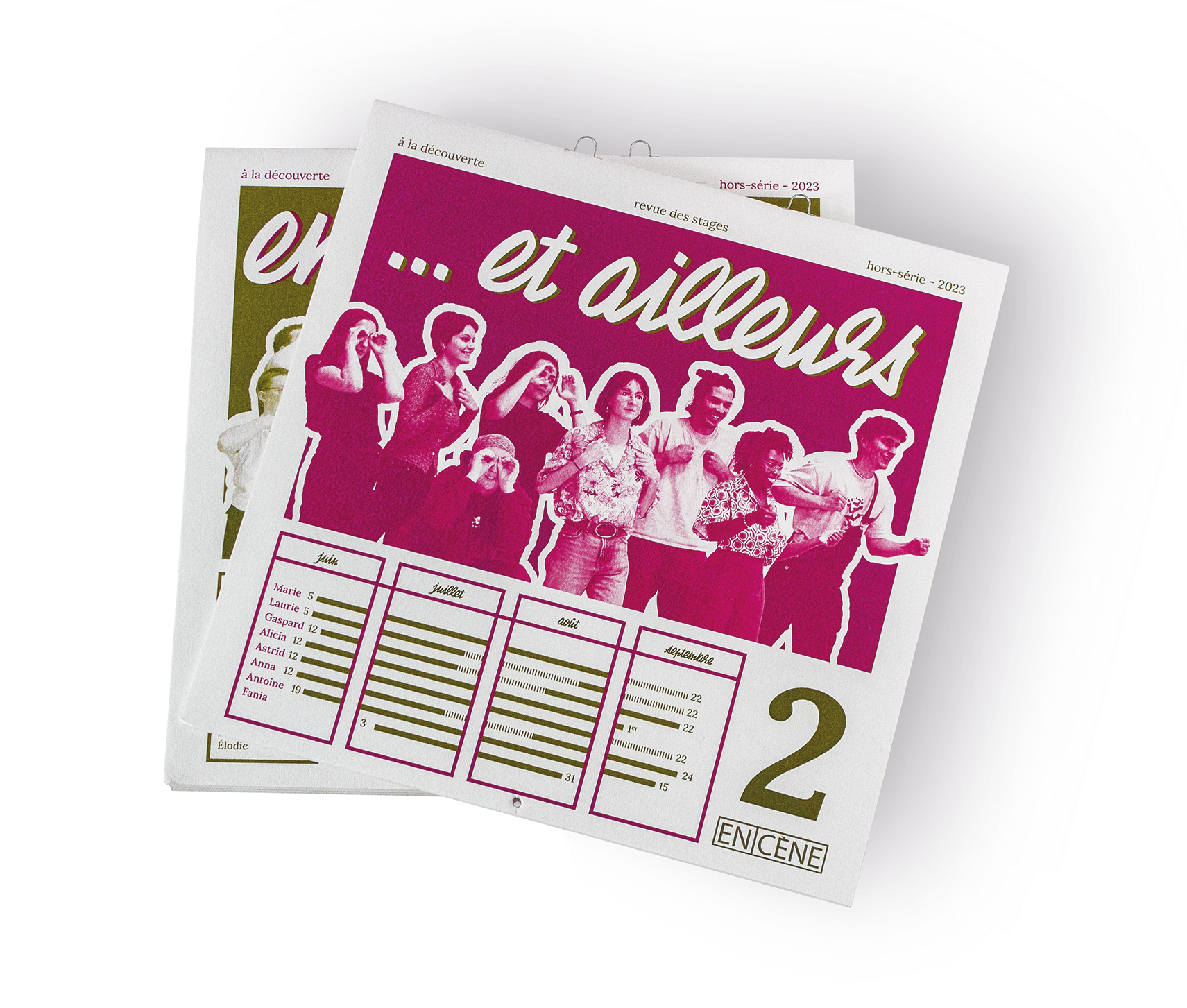 Dans le cadre de mon diplôme en design global et écoresponsable, nous avons conçu une édition pour la revue du lycée : « en cène ». Dès la rentrée, après nos stages d’été, nous avons eu une semaine pour produire cinq exemplaires d’un objet éditorial qui résume tous les stages de notre promotion . Cette revue est destinée à la fois aux visiteurs du lycée lors des journées portes ouvertes, mais aussi aux autres étudiants pour récolter des adresses. En un nombreux réduit de pages, nous avons alors résumé en mettant en pages restes et images. Nous avons fait le choix de distinguées expériences à l’étranger et celle en France pour nous permettre de garder une reliure simple. Le jeu de la bichromie kaki et prune a marqué cette distinction tout en créant un ensemble cohérent. Nous avons aussi joué avec le format carré et en hauteur pour rappeler un calendrier qui fait état de nos découvertes estivales.