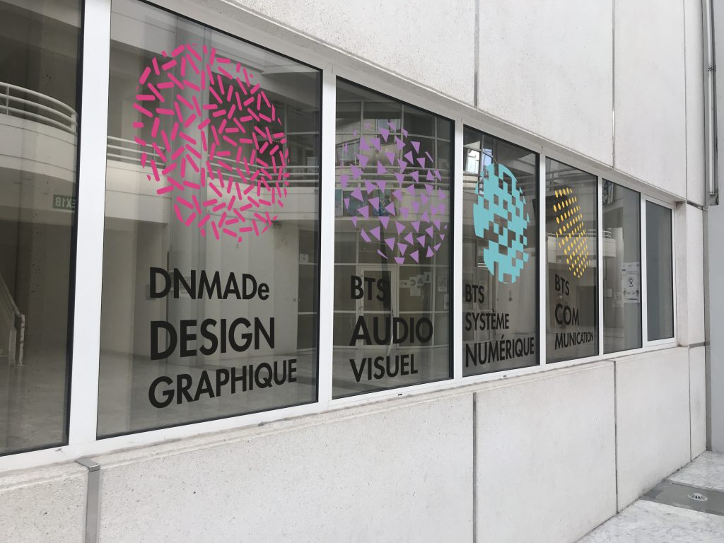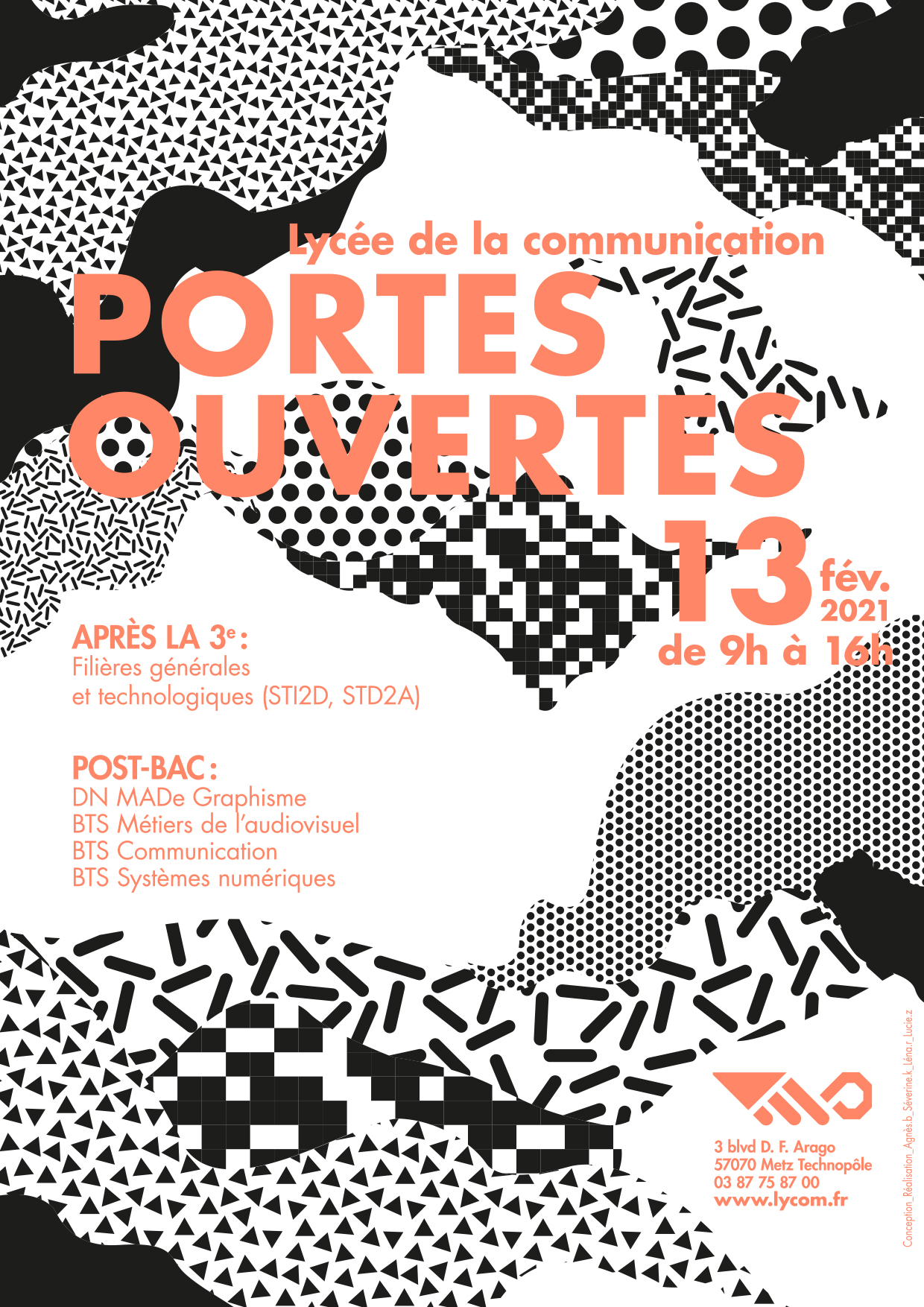 Pour les journées portes ouvertes du lycée de la communication à Metz, nous avons eu l’opportunité de créer l’identité visuelle de l’événement. Avec mon groupe de quatre, nous l’avons ensuite appliqué aux différents supports souhaités par le lycée. La contrainte principale était de mettre en avant toutes les formations du lycée. Nous avons alors décidé de représenter chacune grâce à une forme géométrique adaptée. Sur l’affiche on peut toutes les retrouver, puis dans le lycée, elles vont guider les visiteurs jusqu’à la zone dédiée.