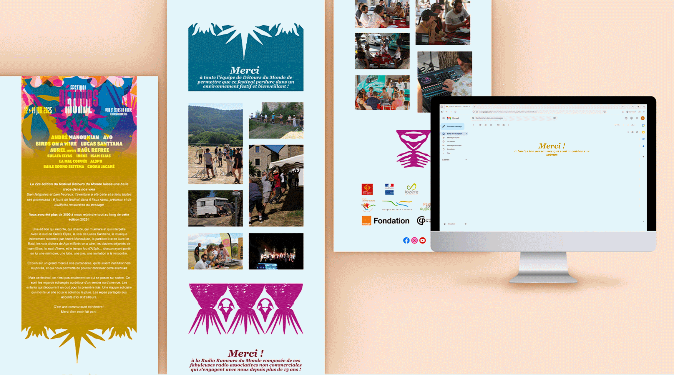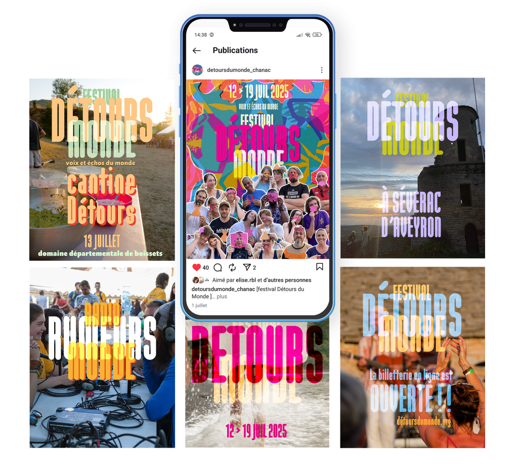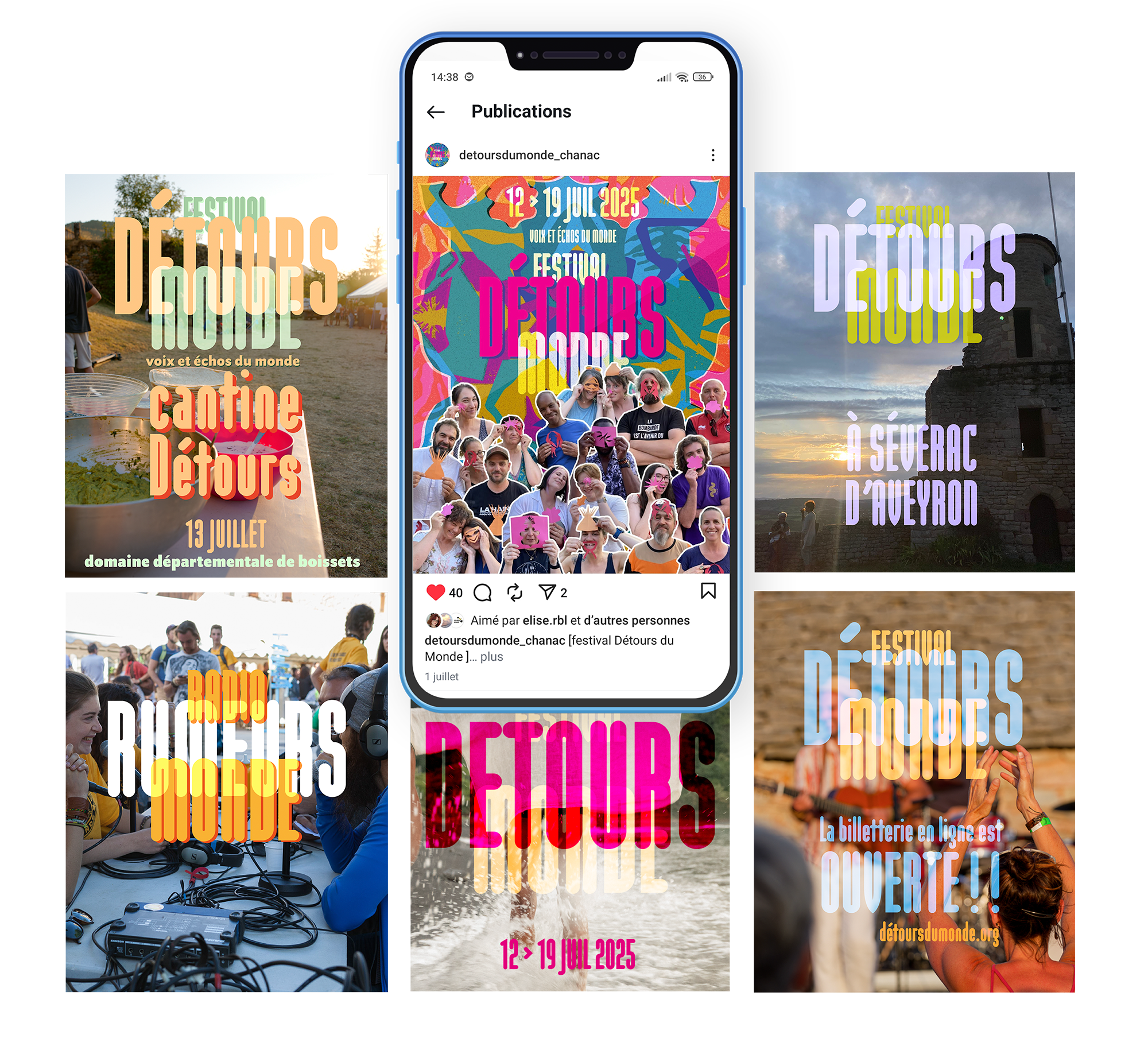 Lors de ces 6 mois, j’ai pu découvrir le milieu festivalier depuis l’intérieur et participer à la communication interne et externe. J’ai utilisé mes compétences graphiques pour décliner la charte print, aux supports numériques, sur les réseaux sociaux et la newsletter. J’ai créé des posts divers avec une continuité graphique et des messages clairs pour le public de Détours du Monde. J’ai ainsi participé à la stratégie de communication pour organiser nos publications.